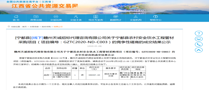 中標喜訊,寧都縣農(nóng)村安全飲水工程管材采購項目